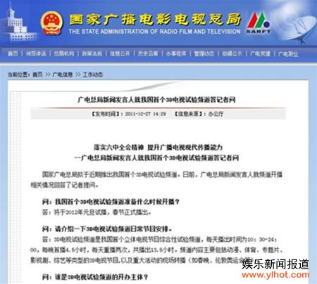 中新网12月27日电 国家广电总局拟于近期推出我国首个3D电视试验频道。日前,广电总局新闻发言人就频道开播相关情况回答了记者提问,并表示将于2012年元旦试播,春节正式播出。
